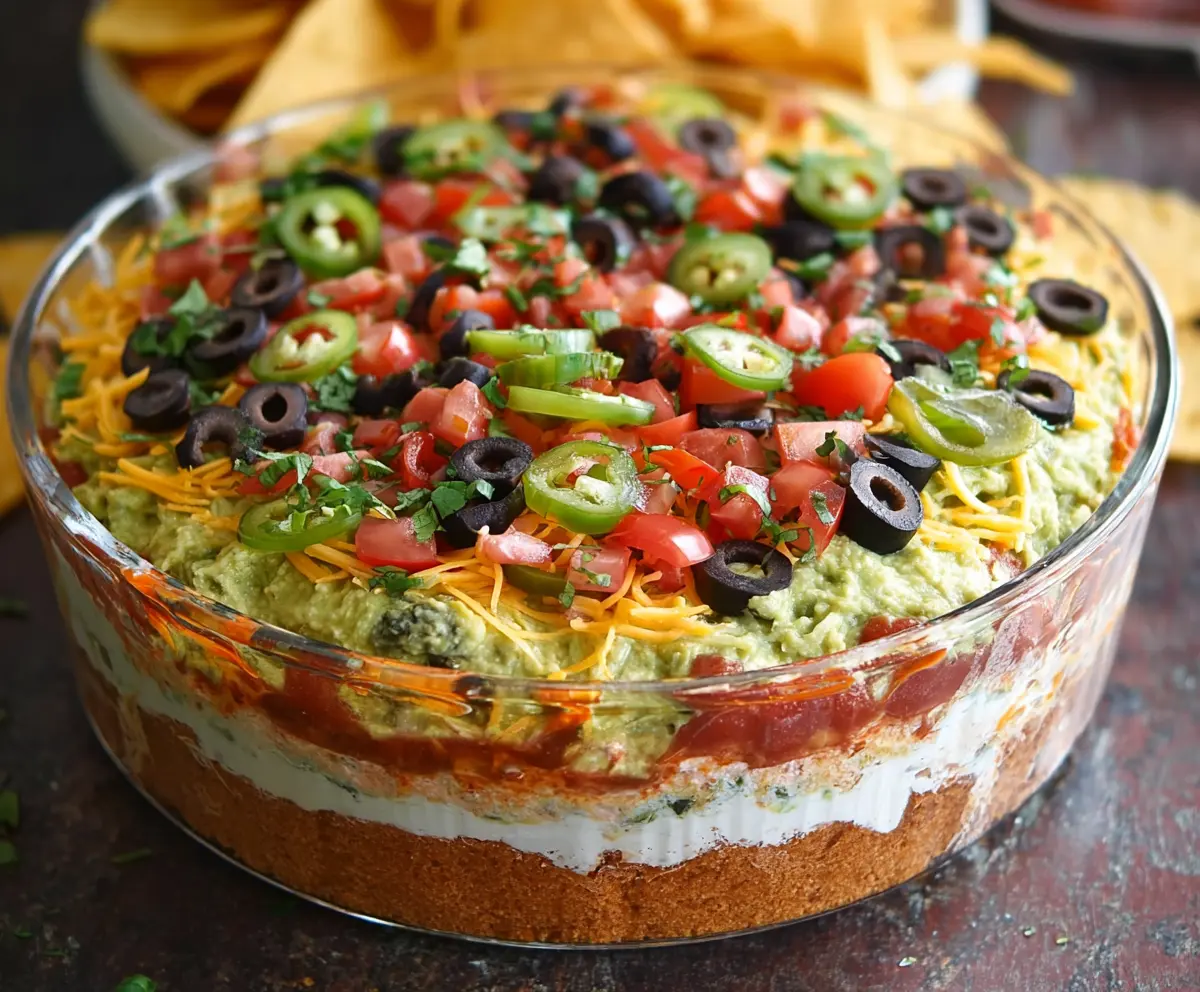 Delicious 5 layer dip with colorful toppings, perfect for parties and gatherings.