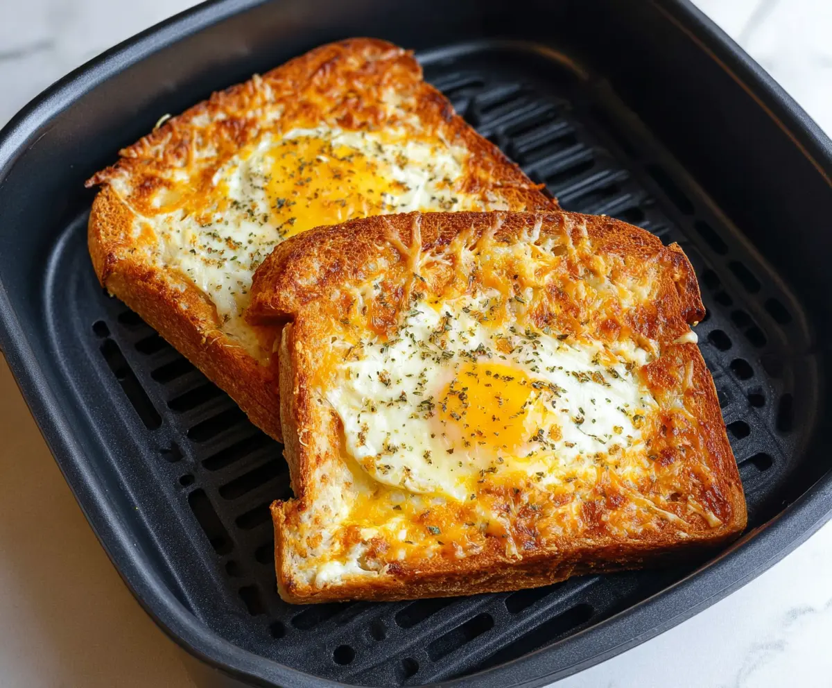Gently place the prepared bread slices in the air fryer basket or tray in a single layer. Cook for about 7-10 minutes. Check at the 7-minute mark to see if the cheese is melted and slightly golden, and ensure the egg whites are set but the yolk is still runny (or cook a bit longer if you prefer a firmer yolk).