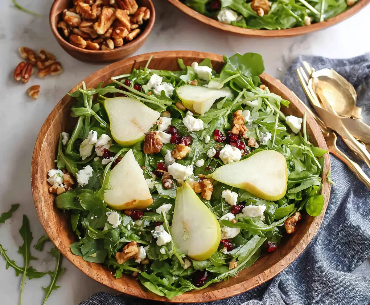 This delightful salad takes about 10 minutes to prepare. It’s a quick and easy dish that combines fresh arugula with sweet pears and crunchy walnuts, making it perfect for a light lunch or side dish!