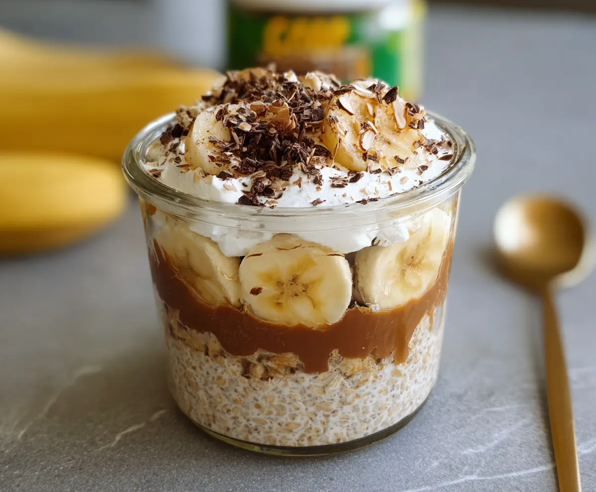 Delicious Banoffee Pie Overnight Oats with banana, caramel, and whipped cream topping.