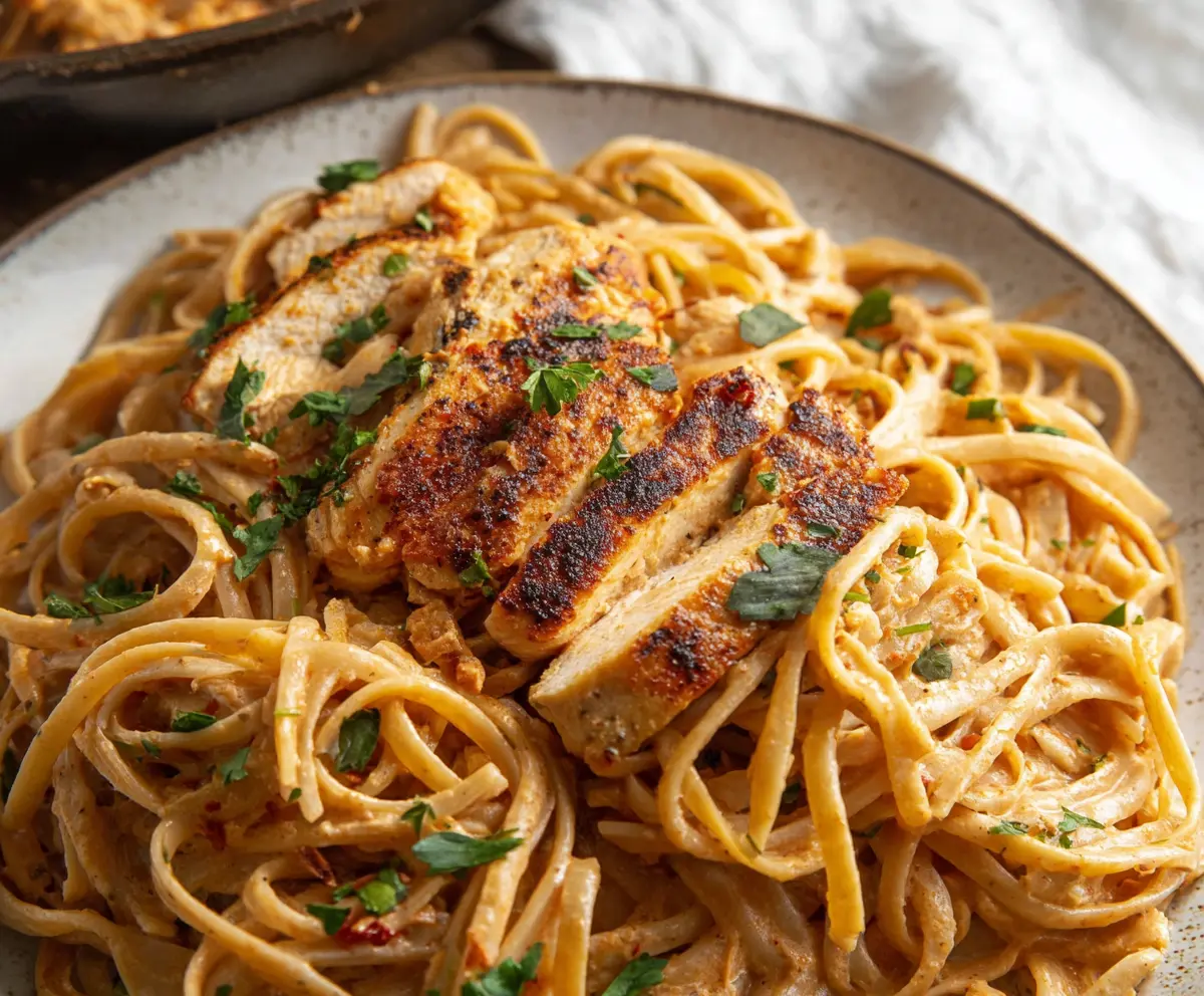 Delicious Bold and Cajun Chicken Spaghetti dish with spicy seasoning and creamy sauce on a plate.
