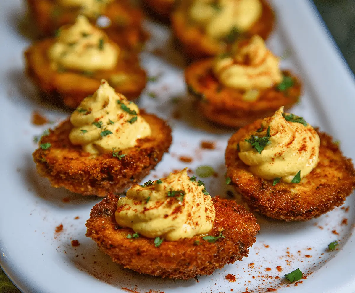 Once all your fried deviled eggs are ready, arrange them on a serving platter. If you want, you can pipe or dollop a little extra deviled yolk mixture on top. Finish off with a sprinkle of paprika and some chopped parsley for color before serving them warm. Enjoy!