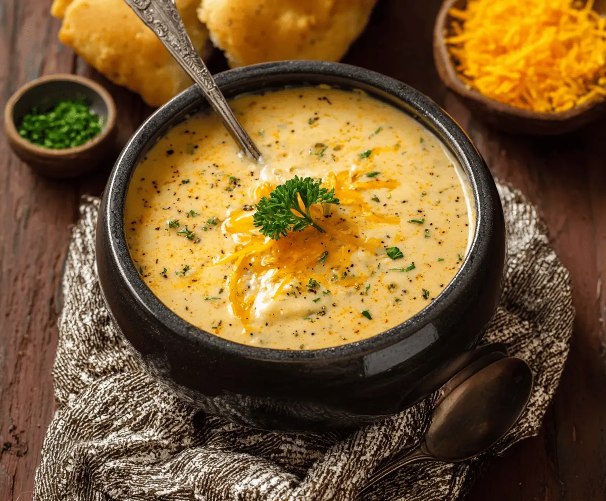 Serve the soup hot, garnished with some extra cheddar cheese and chopped fresh parsley on top. It pairs beautifully with crusty bread for dipping!