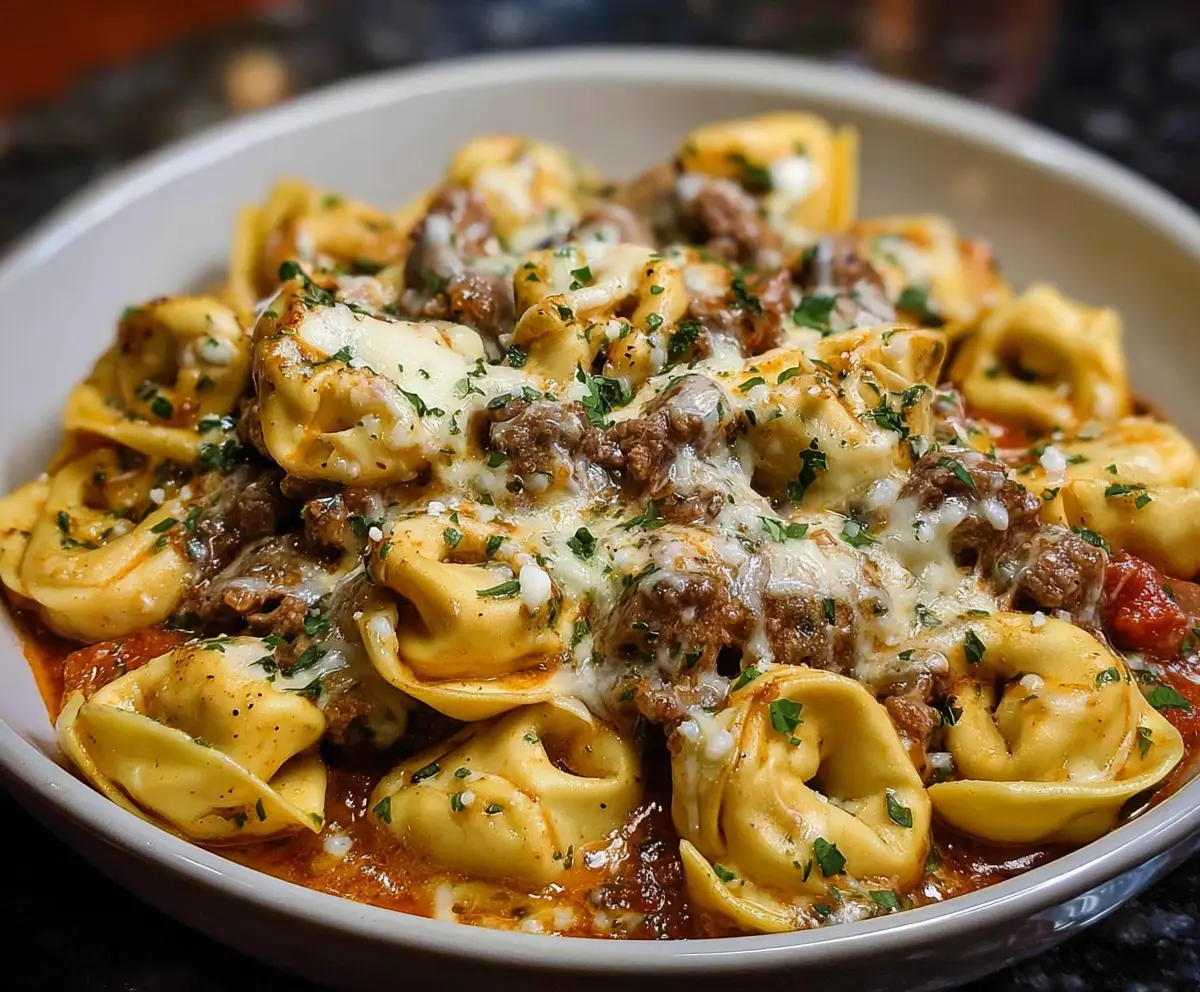 Delicious Cheesesteak Tortellini pasta dish with melted cheese and savory beef slices.