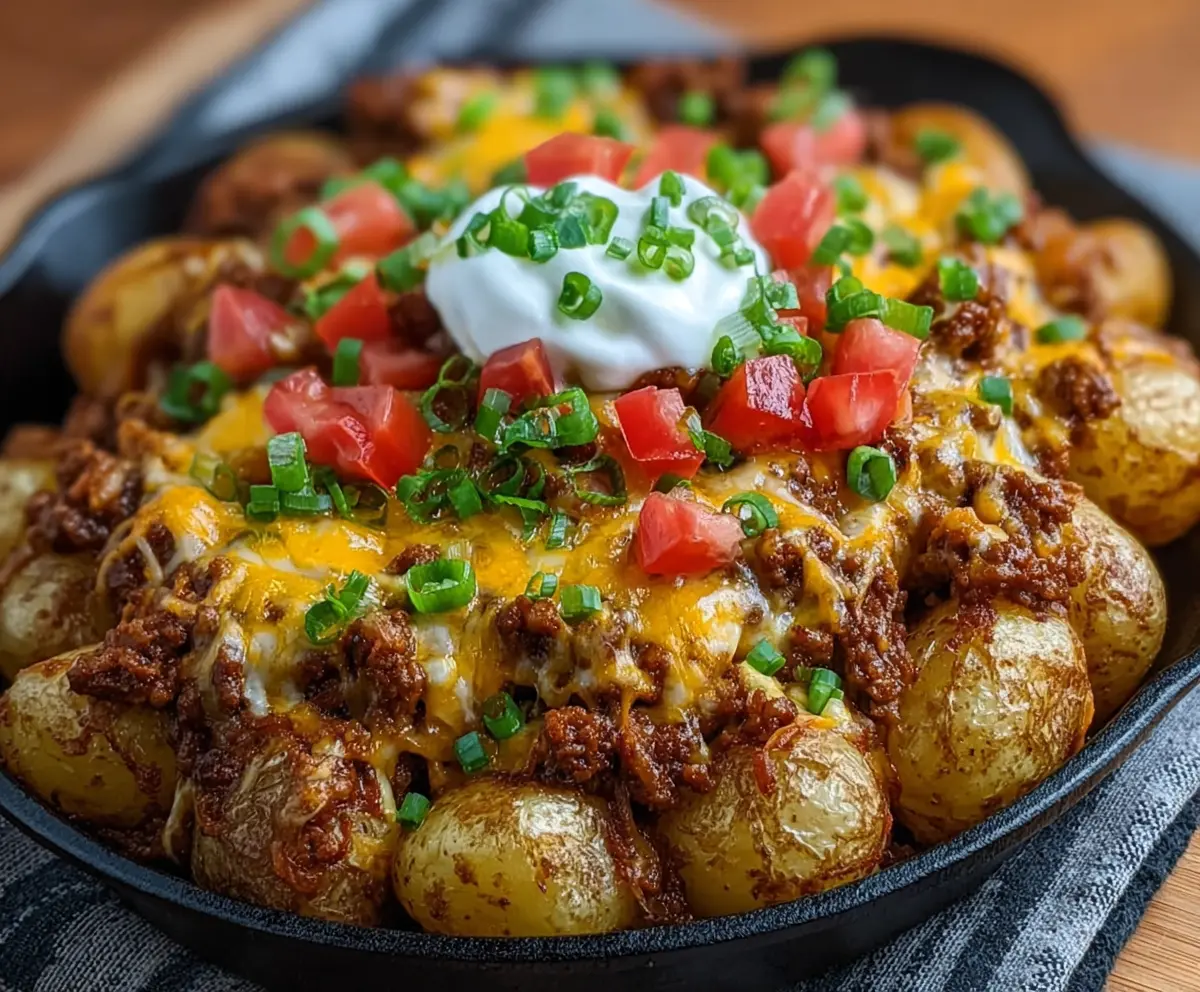 When you remove the skillet from the oven, garnish your cheesy taco potatoes with the diced tomatoes and chopped green onions. Finish it off with a dollop of sour cream right in the center. Serve hot and enjoy this hearty dish either as an appetizer or a main course!