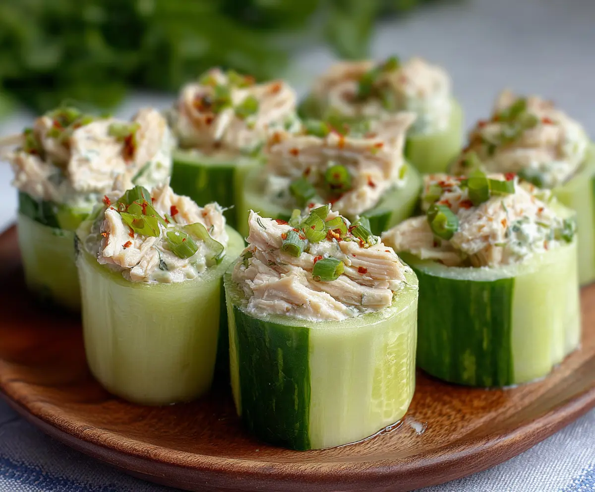 These Chicken Salad Cucumber Roll Ups are a fresh and tasty treat! They combine crisp cucumber slices with a creamy chicken salad filling that is hard to resist.