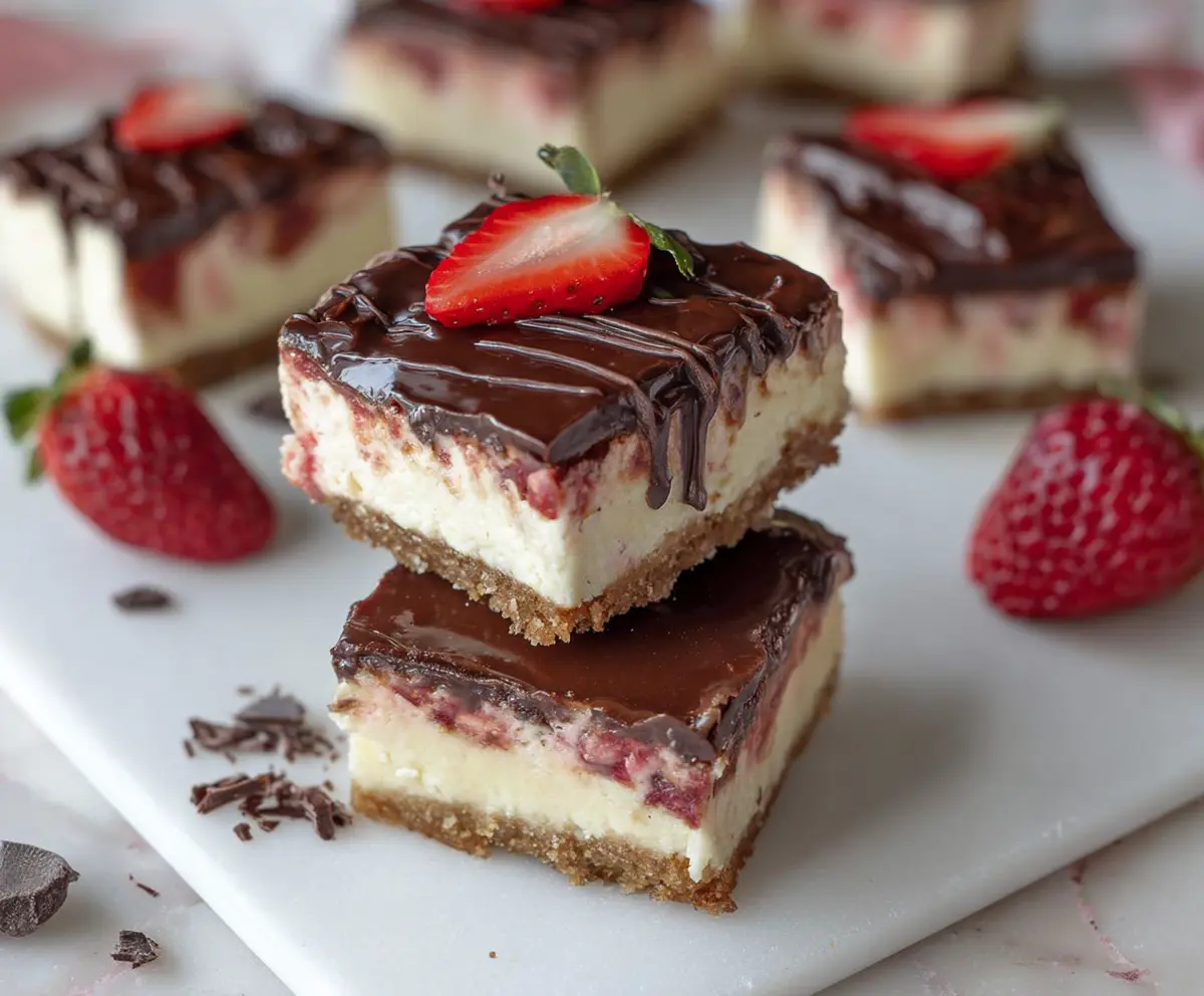These Chocolate-covered Strawberry Donut Cheesecake Bars are a sweet treat you’ll love! With soft donuts, creamy cheesecake, and tasty chocolate-covered strawberries on top, they’re extra special!