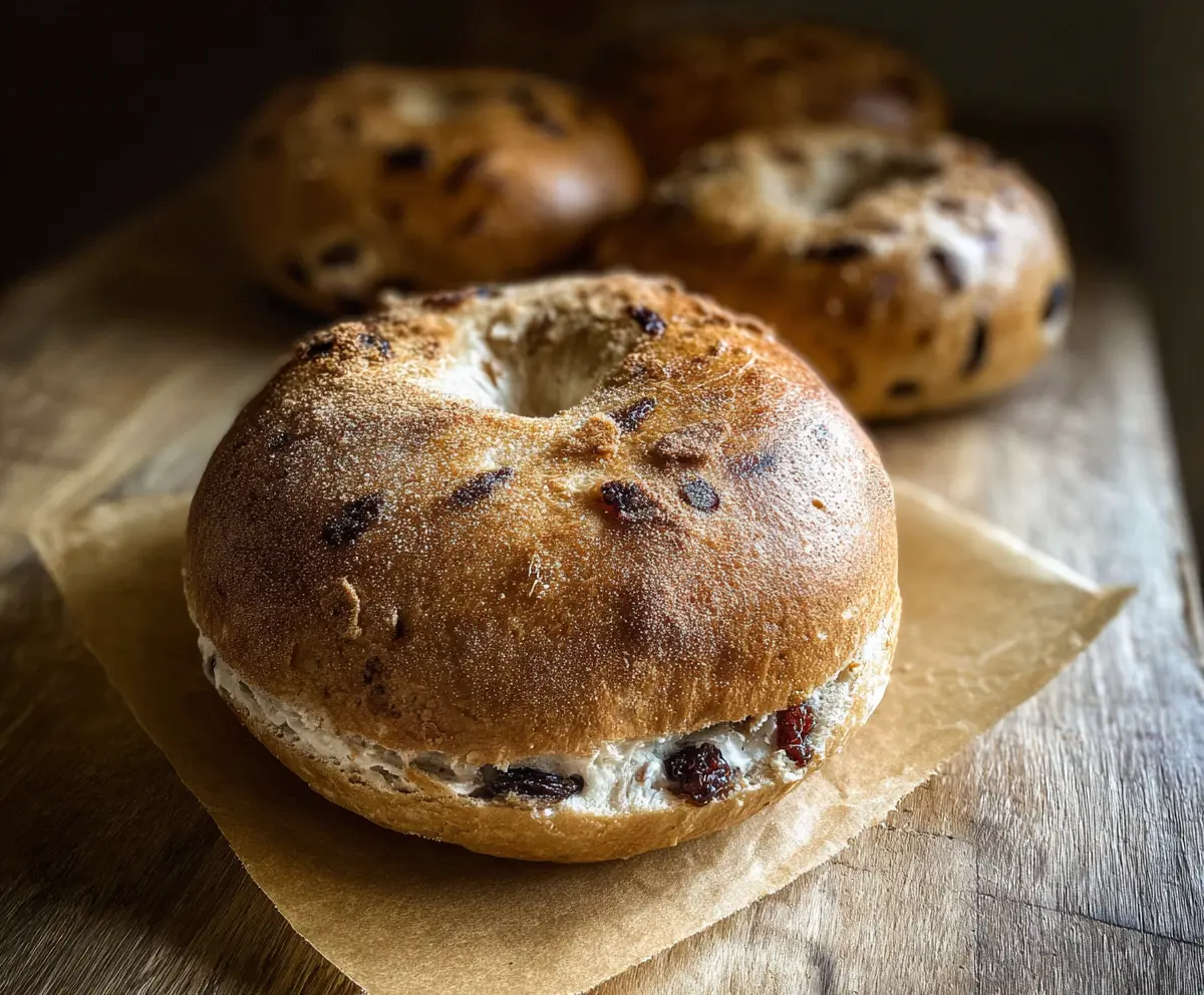 Freshly baked cinnamon raisin sourdough bagels on a rustic wooden surface, showcasing their golden crust and chewy texture.