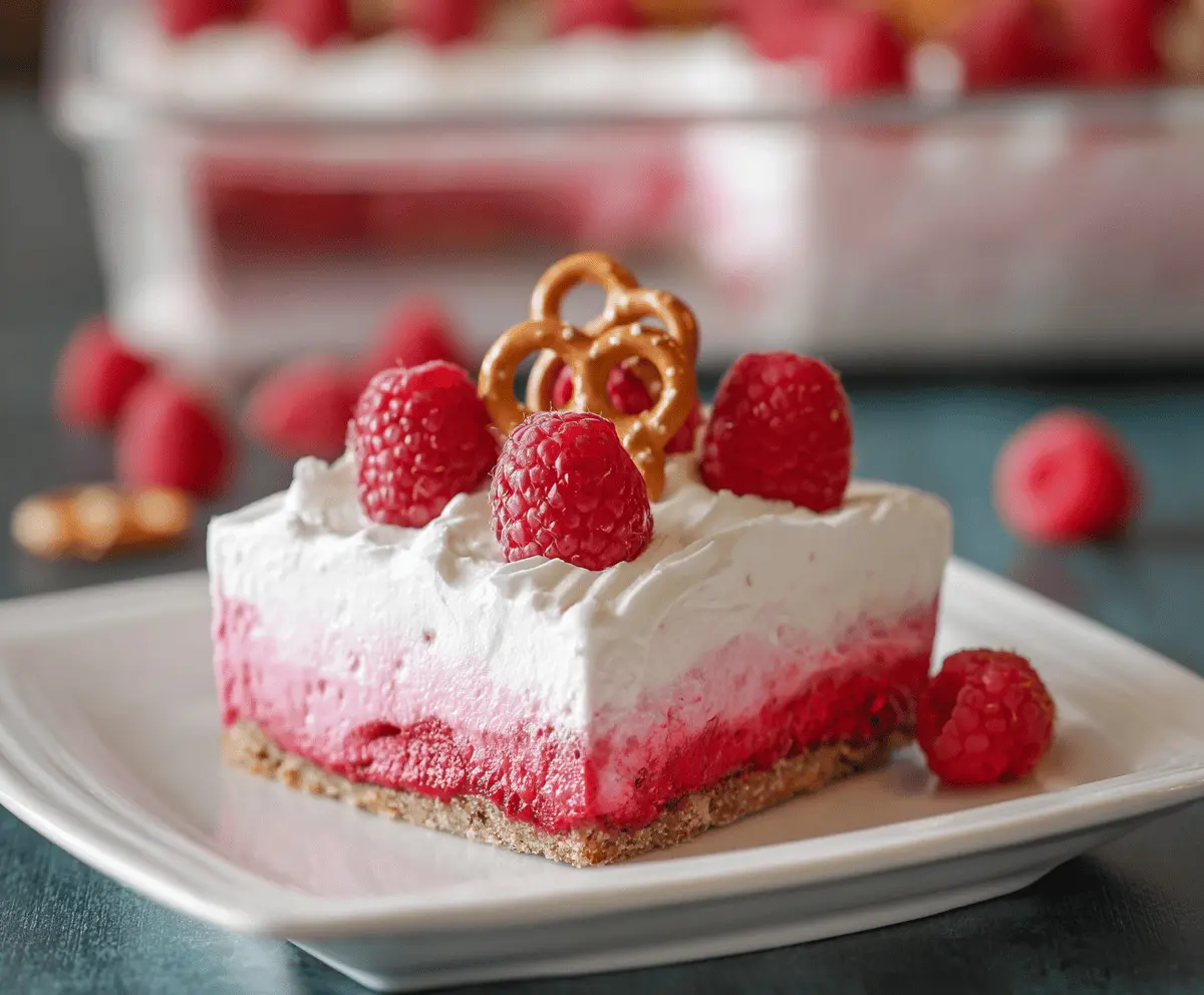 This Creamy Raspberry Pretzel Dessert combines a crunchy pretzel crust with a luscious raspberry layer and a fluffy cream cheese topping. It’s a sweet treat with a fun twist!