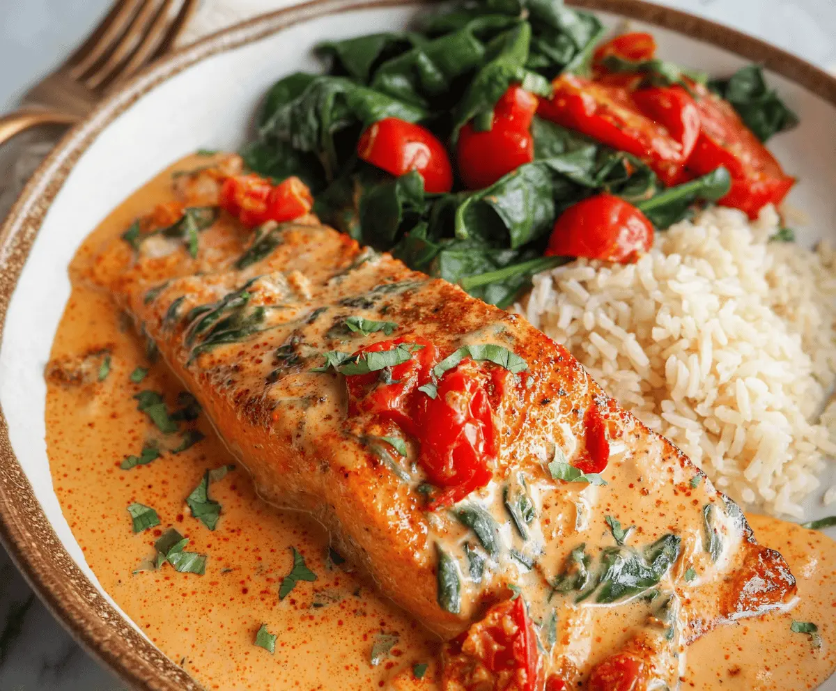 This creamy roasted red pepper salmon is a tasty dish that really shines. The rich sauce made from roasted red peppers adds a unique flavor that’ll make your taste buds dance!
