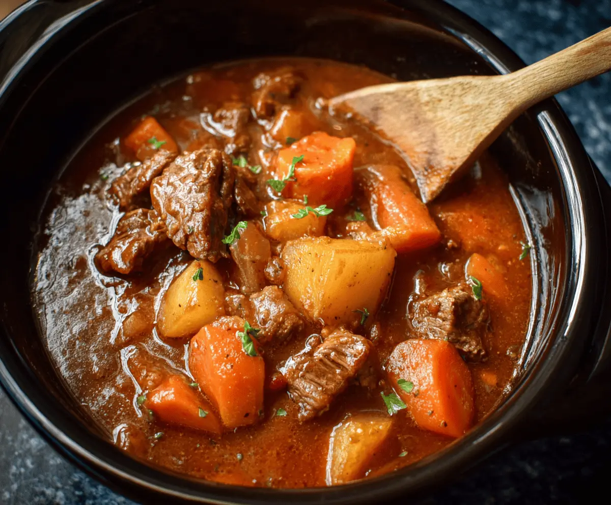 Hearty crockpot beef stew with tender beef chunks, carrots, potatoes, and herbs in a slow cooker bowl