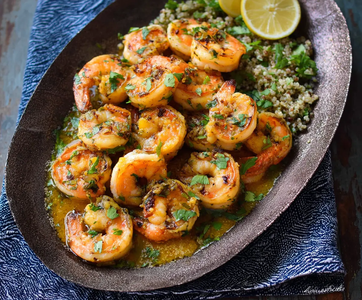 Delicious Cuban Mojo Shrimp served with fresh herbs and lemon wedges
