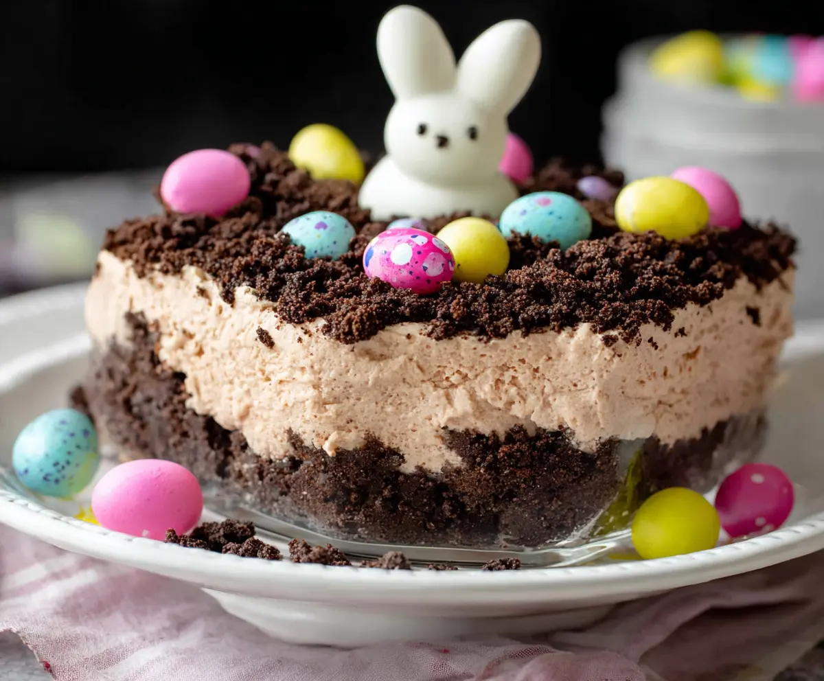 This Easter Dirt Cake is a fun and sweet treat that children and adults love! With layers of creamy chocolate pudding, crushed cookies, and candy eggs, it looks like a garden.