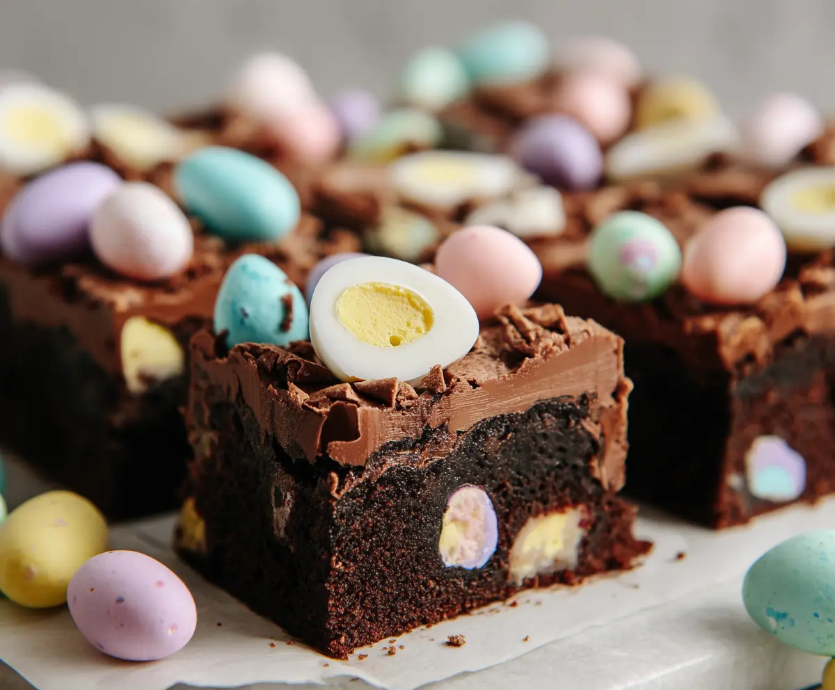 Now it’s time for a little fun—immediately decorate the frosted brownies with more mini chocolate eggs on top. Press them lightly into the frosting so they stick.