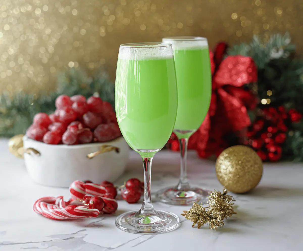 This fun Grinch Mimosa is a cheerful twist on a classic drink! It combines bubbly champagne with vibrant green apple juice, making it festive and refreshing for any holiday gathering.