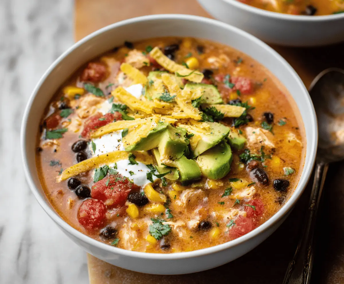 Ladle the soup into bowls and top each serving with a dollop of sour cream, slices of avocado, a sprinkle of shredded cheddar cheese, and fresh cilantro for that vibrant finishing touch. Serve hot with tortilla chips if you love some crunch.