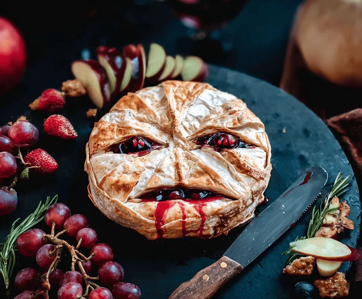 This Halloween Baked Brie is a fun and spooky treat! It’s creamy brie cheese topped with tasty goodies like nuts and honey, all enveloped in golden, flaky pastry.