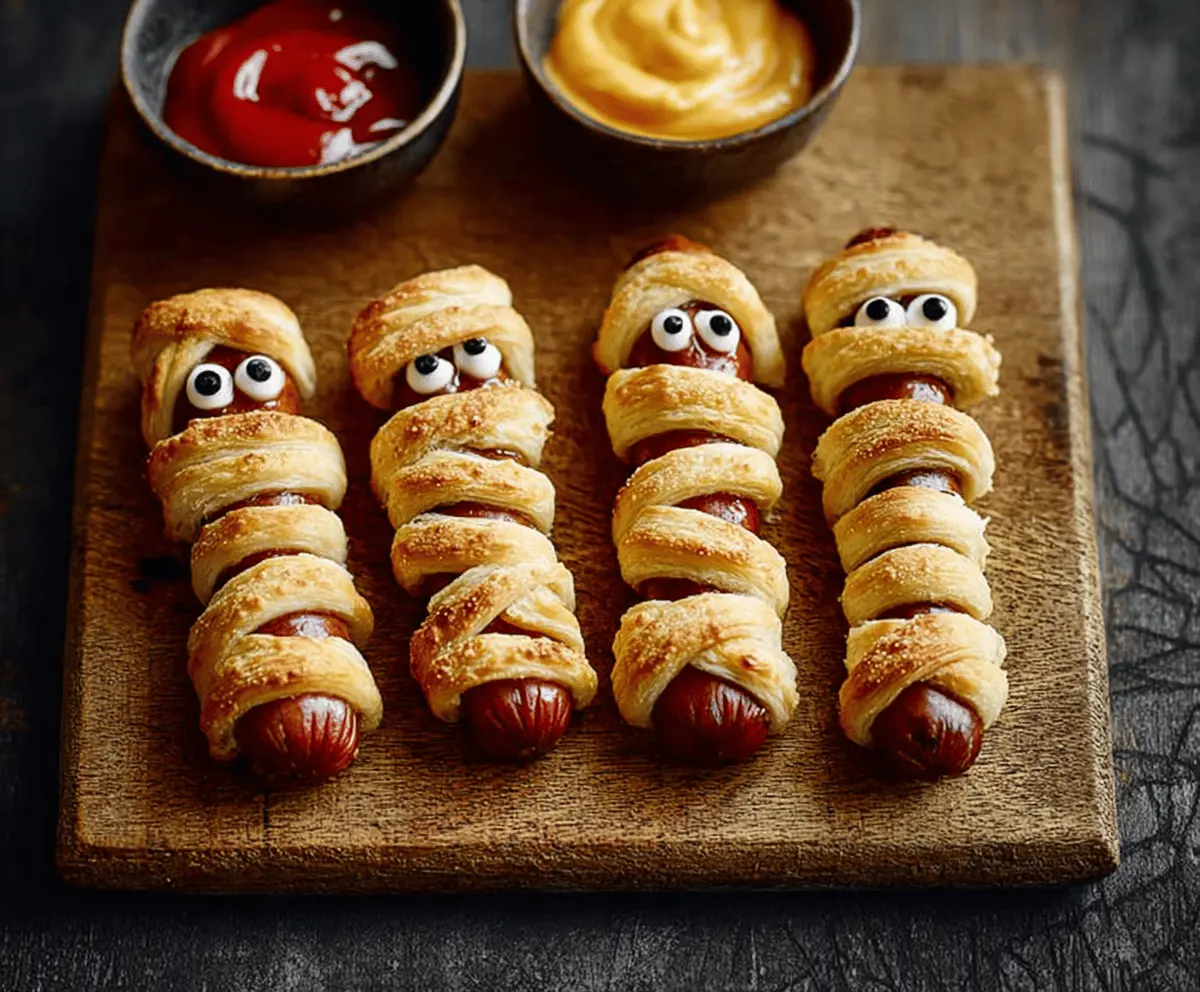 Crispy Halloween mummy sausages wrapped in dough with googly eyes, perfect for spooky party snacks