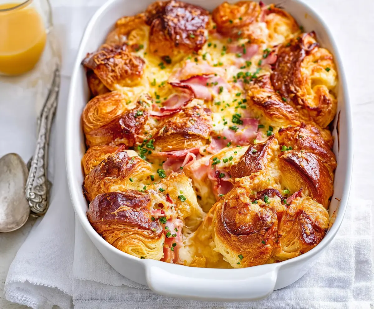 This Ham and Cheese Croissant Brunch Bake is a tasty way to start your day! It’s packed with soft croissants, savory ham, and gooey cheese, all baked together to perfection.