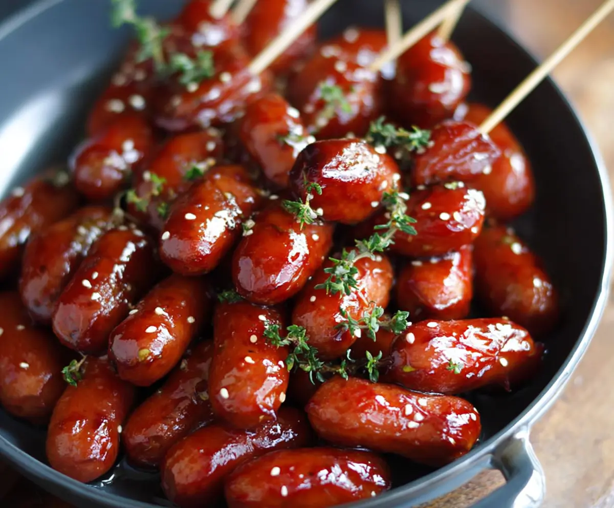 Sprinkle sesame seeds and add fresh thyme or parsley sprigs for garnish. Serve the smokies warm, and don’t forget toothpicks for easy snacking!