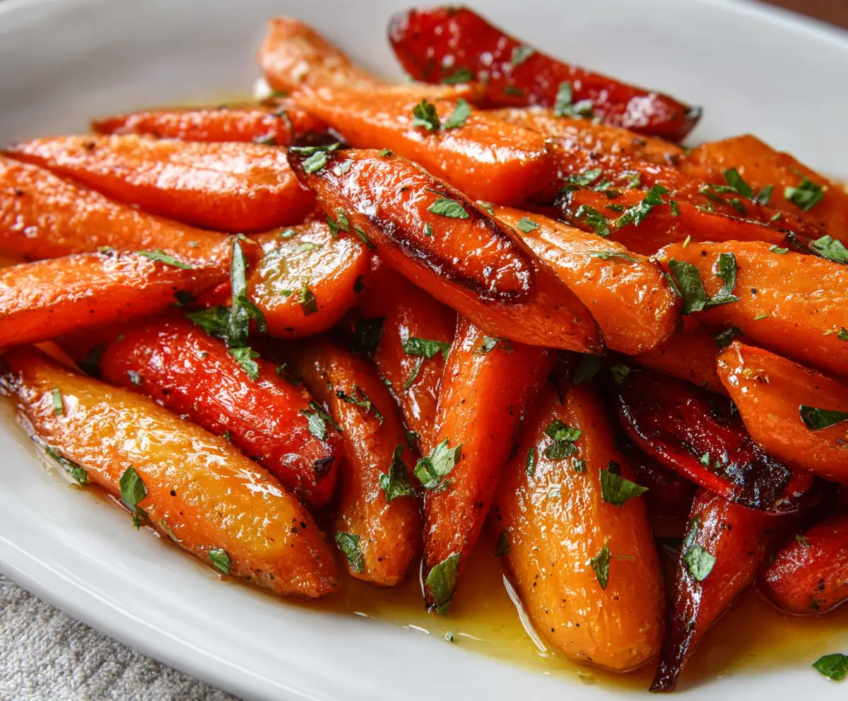 Delicious honey glazed carrots served on a white plate, showcasing a sweet and glossy appearance perfect for a healthy side dish.