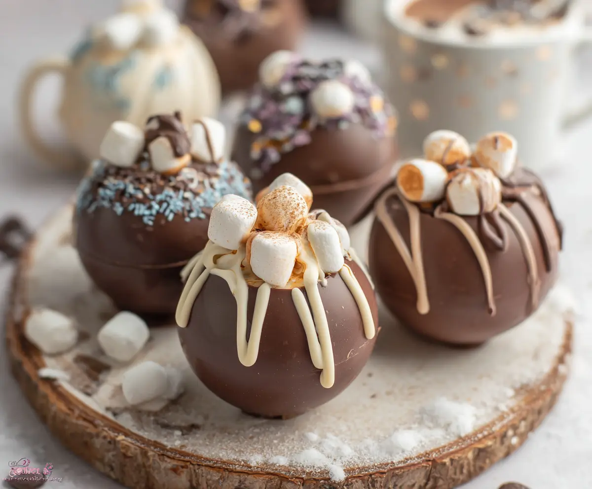 Delicious hot chocolate bombs with rich chocolate shells and marshmallow filling for a cozy treat.