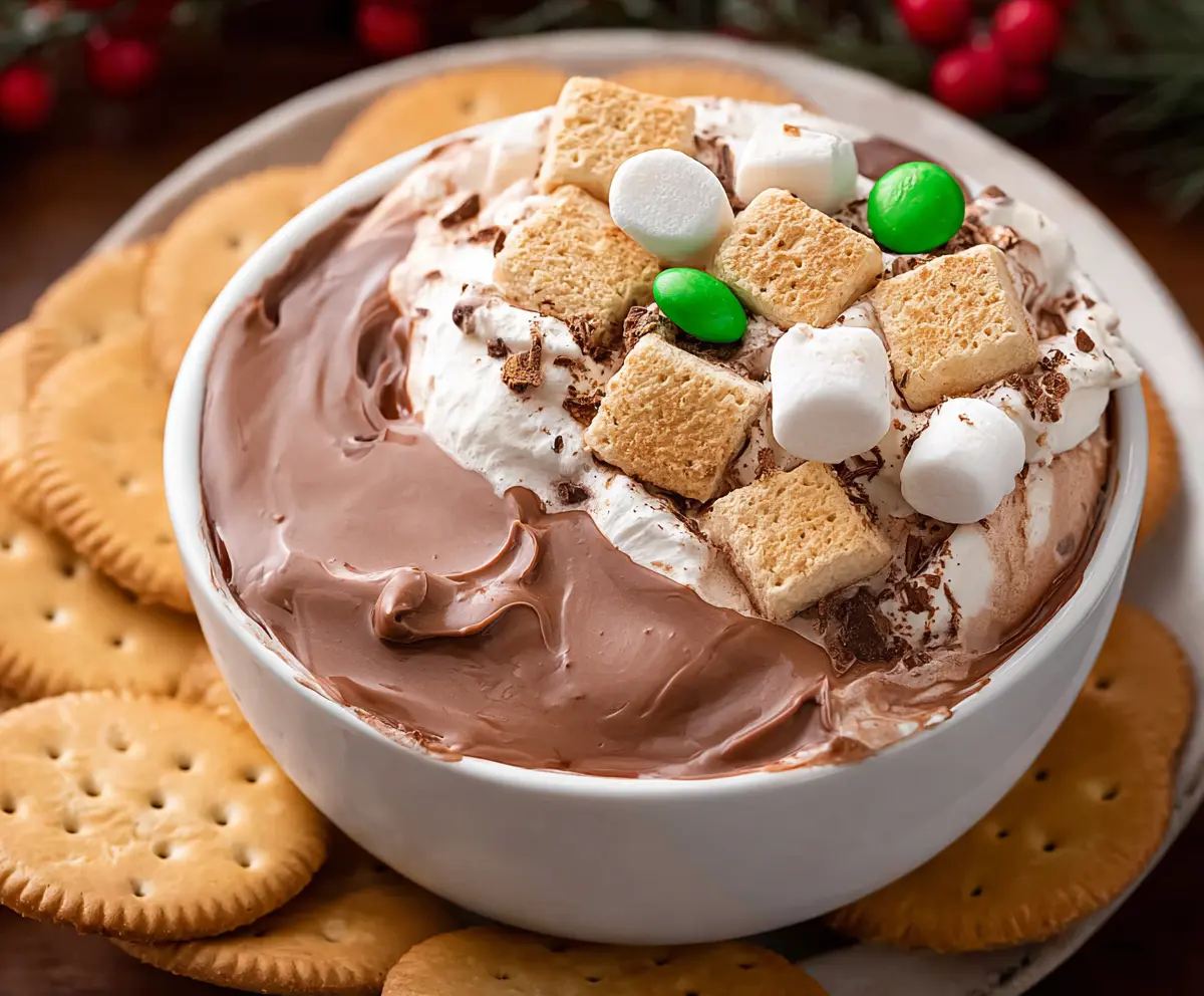Transfer the dip to a serving bowl. Now for the fun part! Top it with mini marshmallows, sprinkle some chocolate shavings, and, if you like, add red and green chocolate candies for a festive touch.