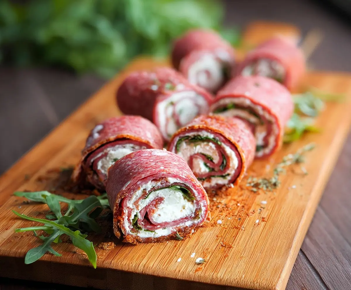Delicious Keto Salami Roll-ups with cream cheese and herbs, perfect for low-carb snacks