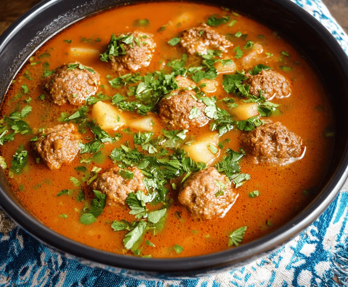 Pour in the beef broth and bring everything to a gentle boil. Once it’s bubbling, reduce the heat to a simmer. Carefully add the meatballs one by one into the soup, avoiding overcrowding. Gently add the diced potatoes as well. Allow the soup to simmer for about 25-30 minutes, or until the meatballs are fully cooked and the potatoes are tender when poked with a fork.