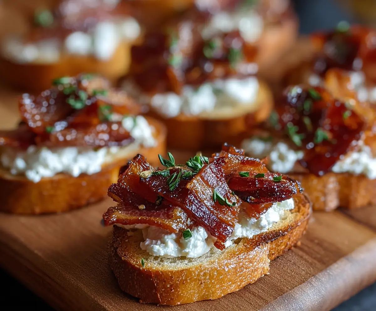 Time to put it all together! Spread a generous layer of the cream cheese mixture on each toasted baguette slice. Then, top each slice with a piece or two of your caramelized bacon.