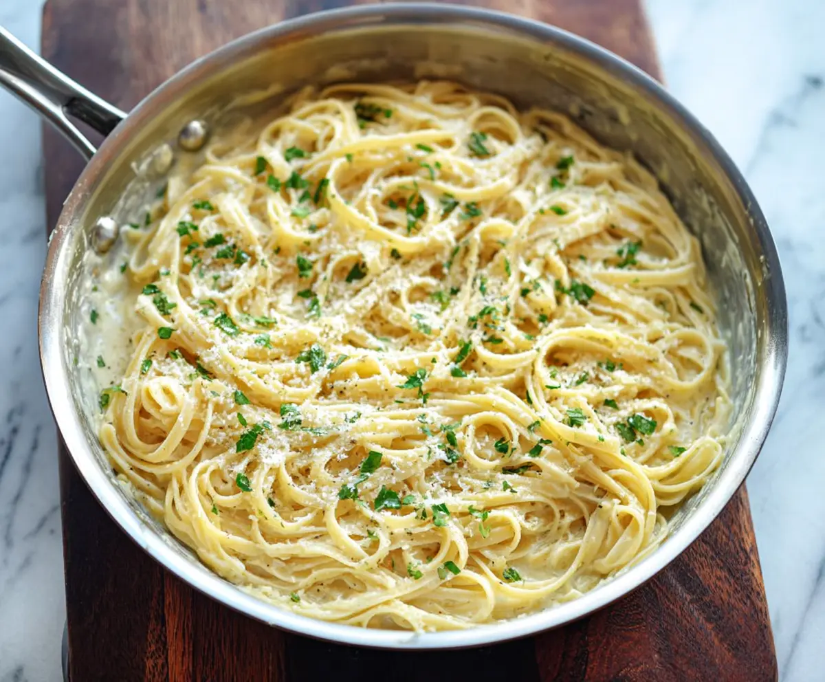 Delicious one-pan garlic Parmesan pasta served on a rustic wooden table.