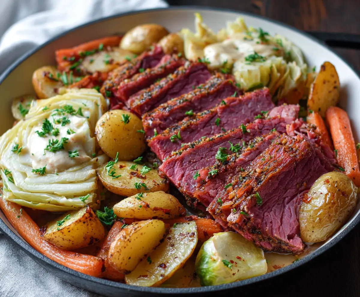Slice the corned beef thinly against the grain and plate it with the roasted cabbage, carrots, and potatoes. Garnish with freshly chopped parsley for an extra touch.