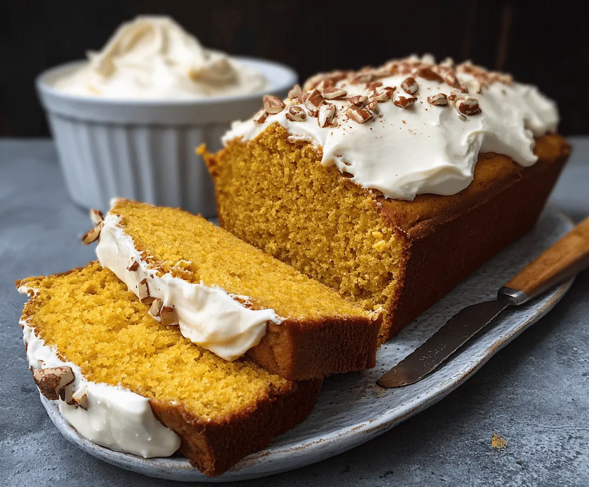 This wonderful recipe yields a dense, moist pound cake infused with charming pumpkin spice flavors and topped with luscious cream cheese frosting and crunchy pecans. Happy baking!