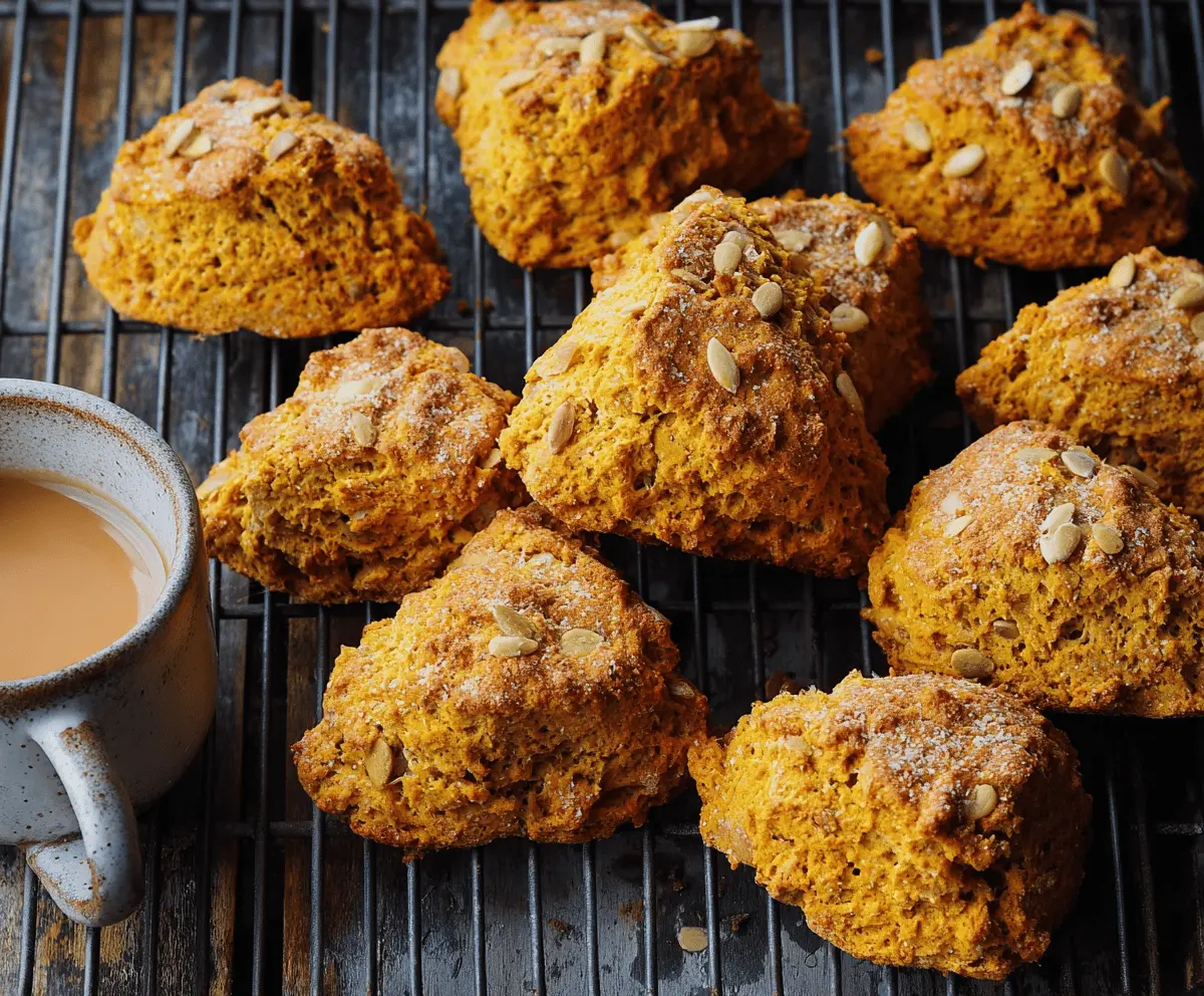 Delicious freshly baked pumpkin scones with a golden-brown crust, perfect for fall breakfast or tea time