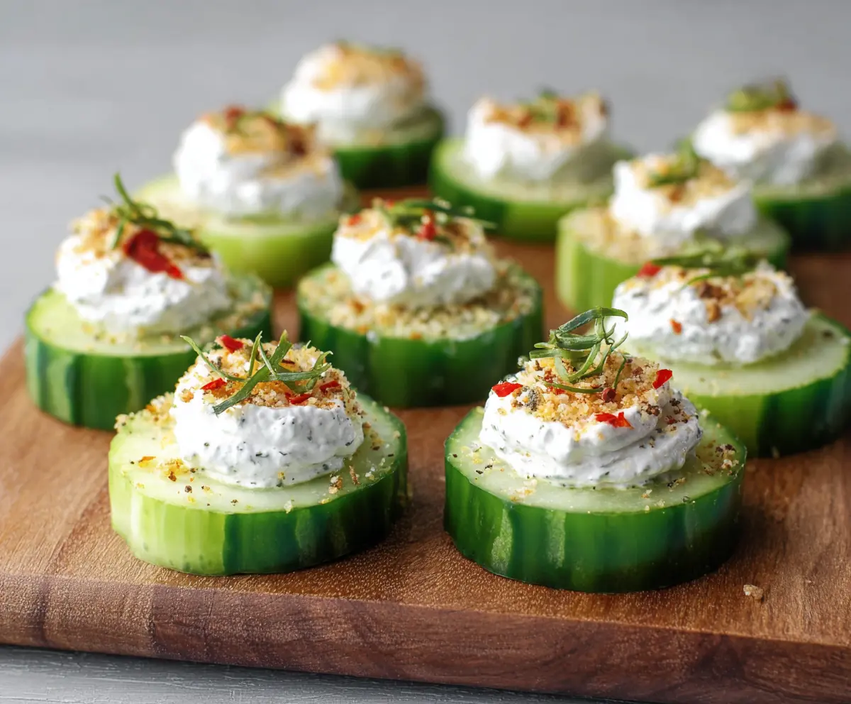 These bite-sized veggies combine crisp cucumber with tangy ranch cream and a crunchy topping, making them perfect for parties or a quick, healthy snack!