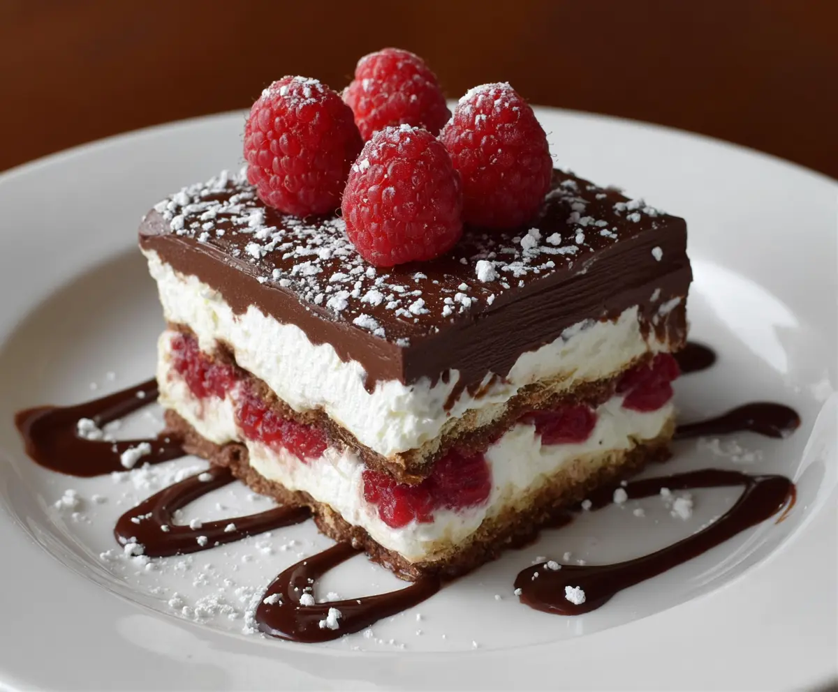 Delicious Raspberry Chocolate Lasagna dessert with layered raspberries and chocolate for a sweet treat
