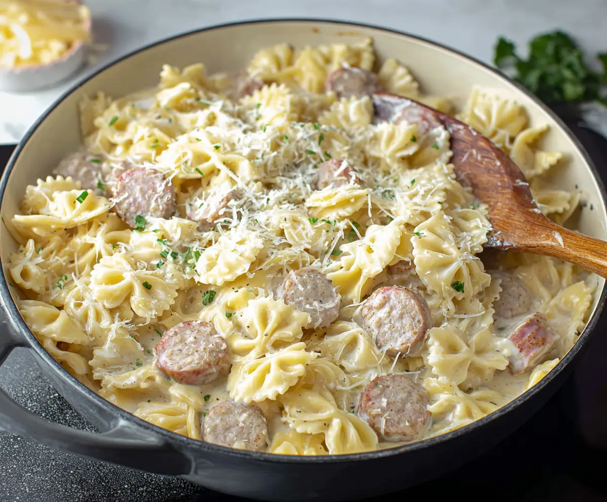 Add the cooked pasta and the sausage slices back into the skillet. Gently toss everything together to ensure the pasta and sausage are evenly coated with the creamy sauce.
