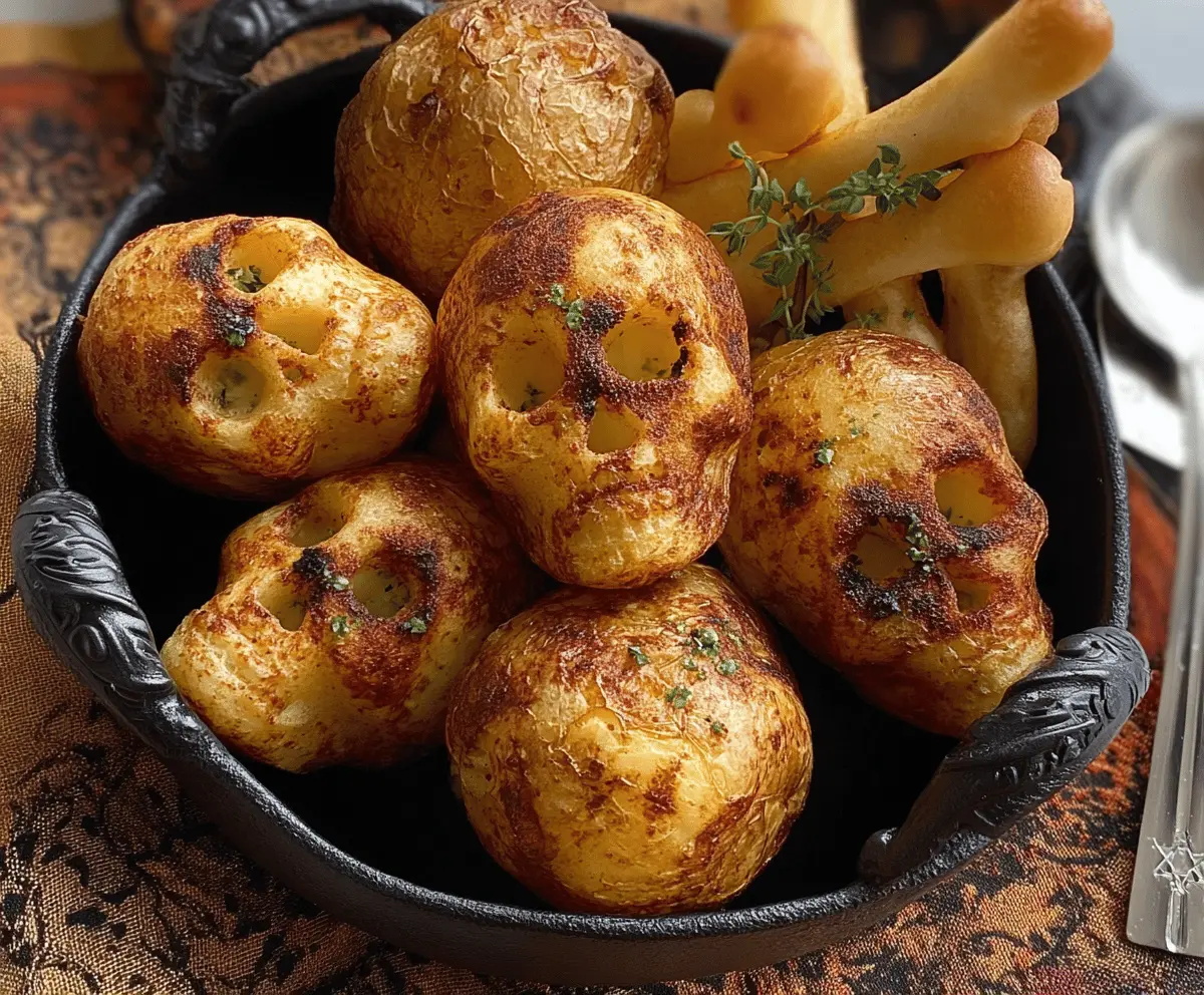 Decorative Skull Potatoes served with Bone-Shaped Breadsticks, perfect for spooky-themed parties or Halloween celebrations.