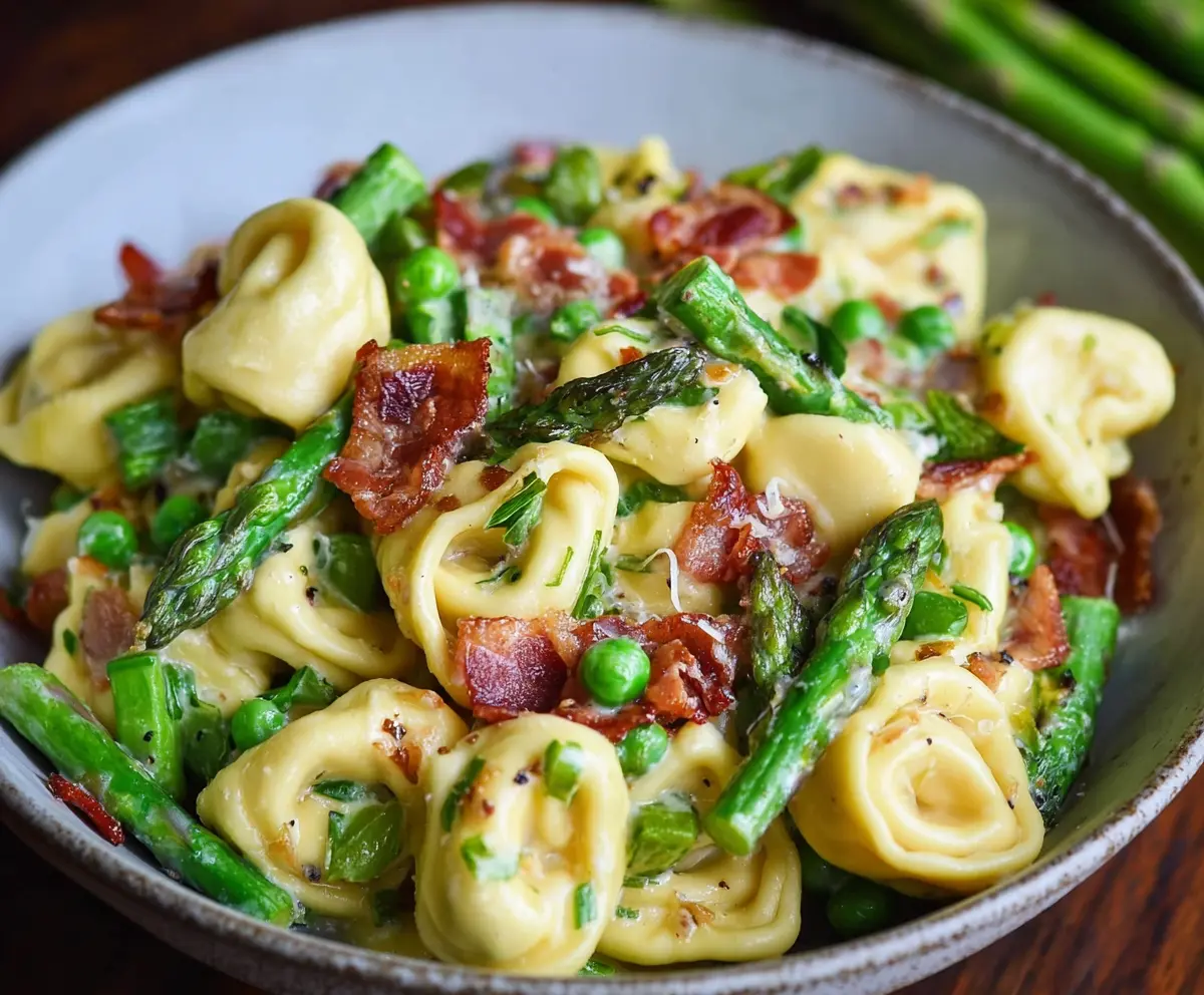 This tasty dish combines cheesy tortellini with fresh peas, tender asparagus, and crispy bacon. It’s colorful, packed with flavor, and makes dinner feel special!