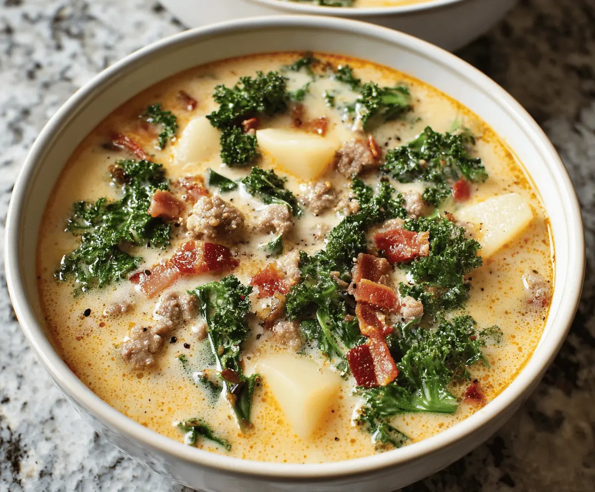 Zuppa Toscana Soup is a warm, comforting dish filled with fresh kale, spicy sausage, and creamy potatoes. It’s like a big hug in a bowl—perfect for chilly days!